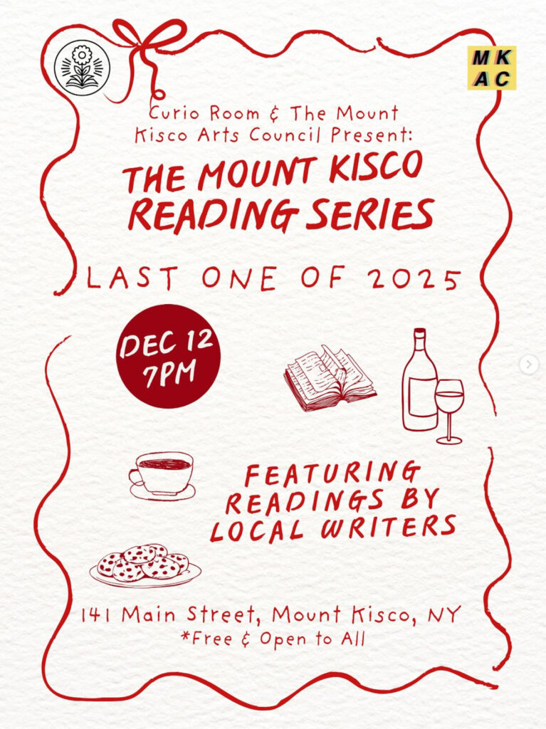 A Mount Kisco Reading Series Featuring readings by local writers. Last one of 2025! Featuring readings by local writers. Presented by Curio Room & The Mount Kisco Arts Council. Free & Open to All. The evening will be relaxed and celebratory, with light refreshments, coffee, tea, and wine. Curio Room: 141 Main Street, Mount Kisco,